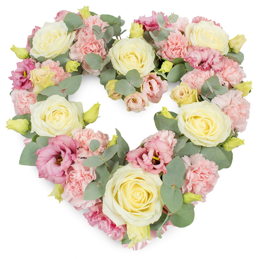 Delight in the timeless beauty of our tribute bouquet, artfully arranged to convey a message of love and remembrance. The bouquet features luminous white roses, delicate pink carnations, and charming pink lisianthus, accented by aromatic eucalyptus leaves. Each component is hand-selected to guarantee the highest quality and lasting vibrancy.
